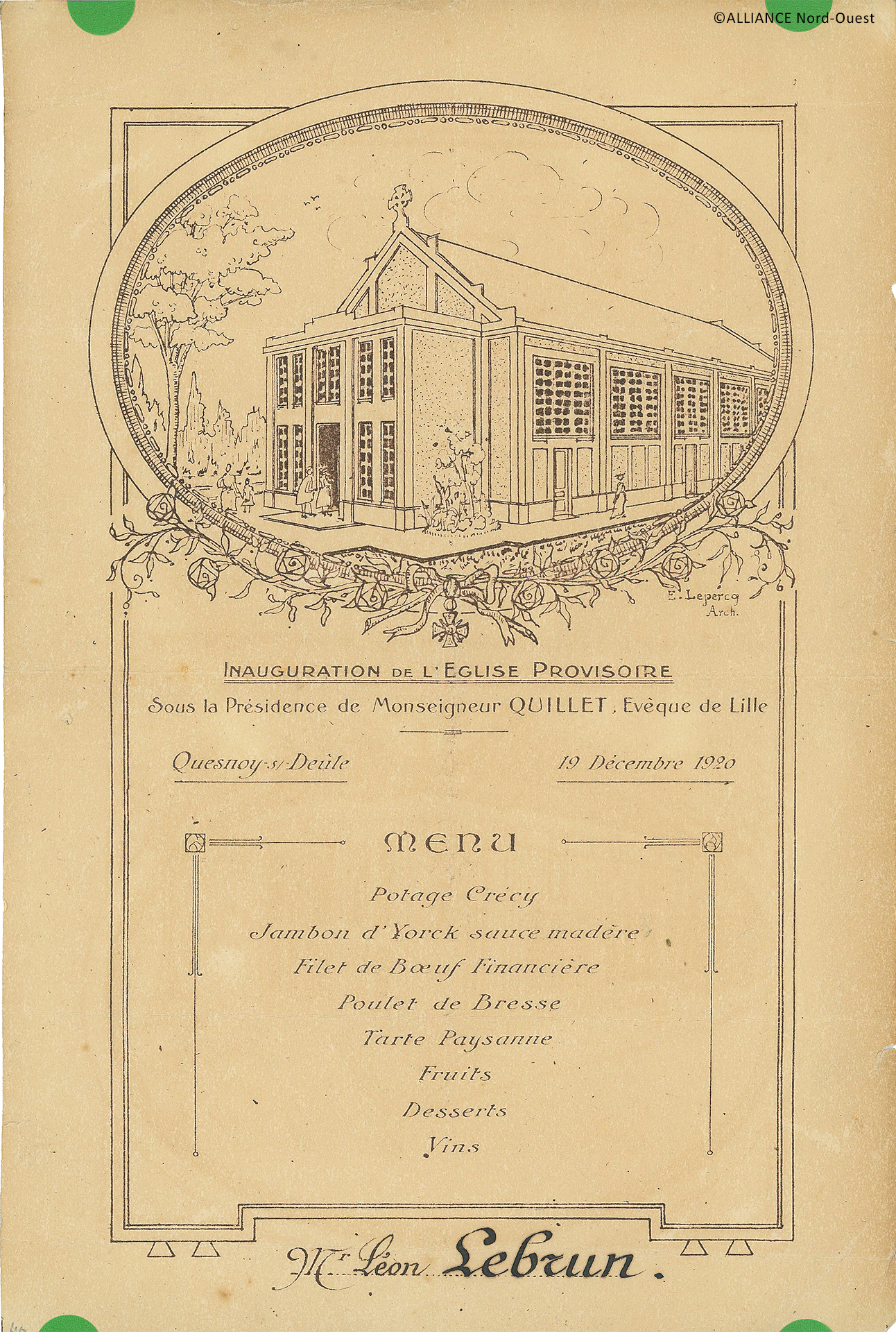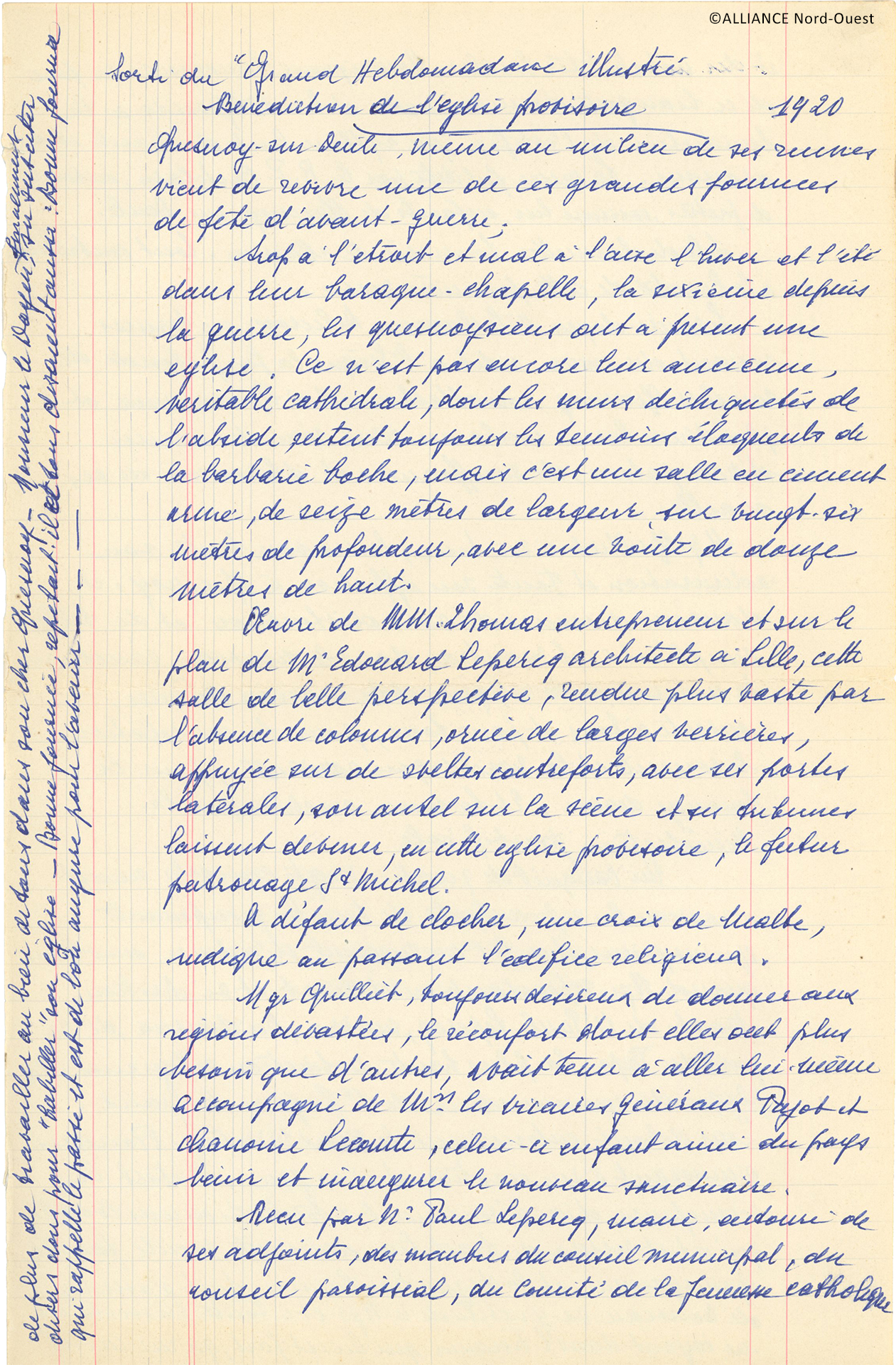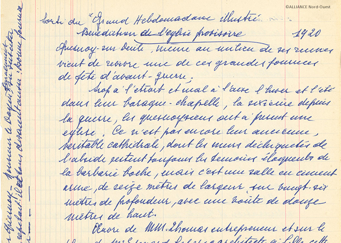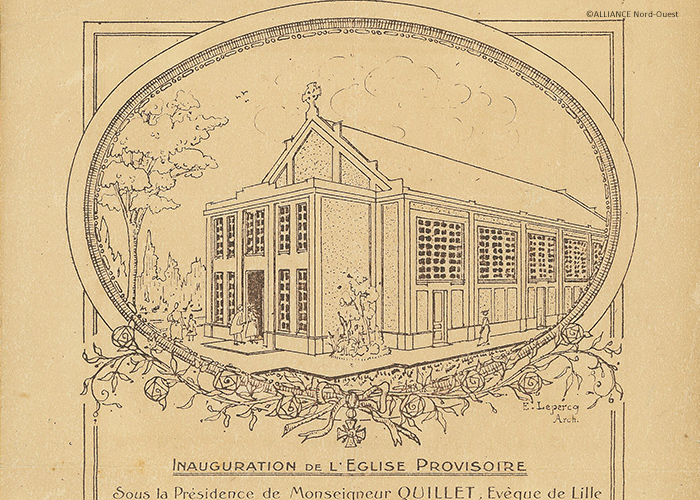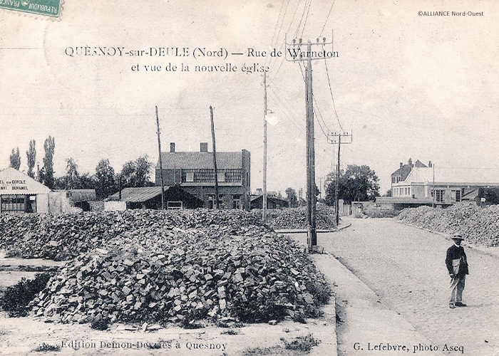 Reconstruite en 1863 et désignée en 1914 par l’évêque de Lille « Cathédrale de la Vallée de la Lys », l’église de Quesnoy-sur-Deûle est bombardée et incendiée en 1917. Au sortir de la guerre, un lieu de culte temporaire est rapidement construit à la place de l’ancien patronage. Inauguré le 19 décembre 1920, il devient le lieu de culte de la ville jusqu'à la mise en service de l’église Saint-Michel en 1932.