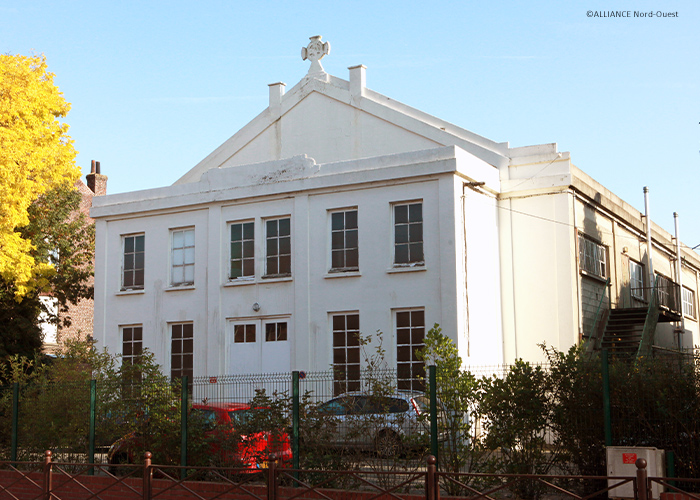 Avec sa façade en béton armée surmontée d’une croix de Malte, cette bâtisse est facilement repérable dans la rue de Warneton. Seul son campanile, bâti sur le côté de la salle, n’est plus visible.
