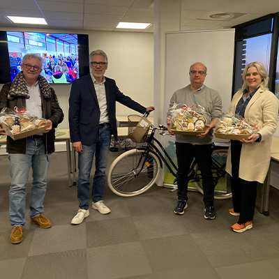 Ce mercredi 18 mars, les trois lauréats de la tombola Le Père Noël est sportif ont été accueillis par Monsieur Liénart, Vice-Président à l'animation territoriale pour leur remettre leurs lots. Un vélo, un sac de rando, des paniers garnis de produits du territoire et des entrées offertes par la Base de loisirs du Fort ont fait la joie de nos sportifs de fin d’année.